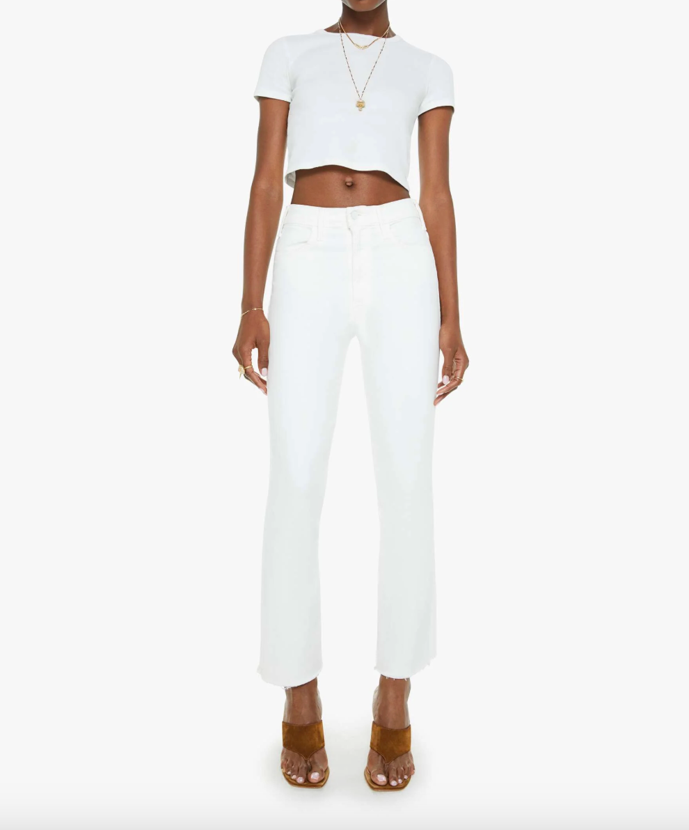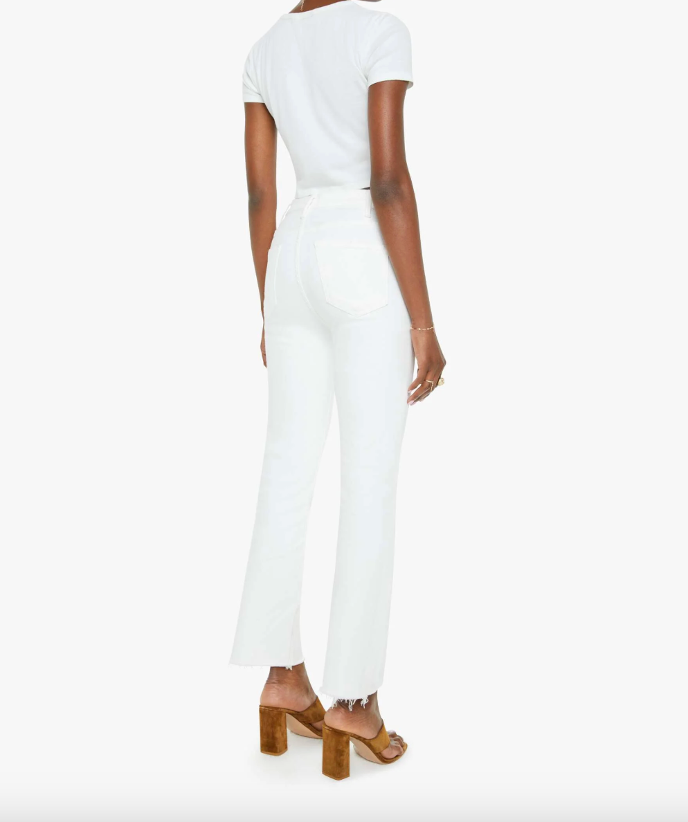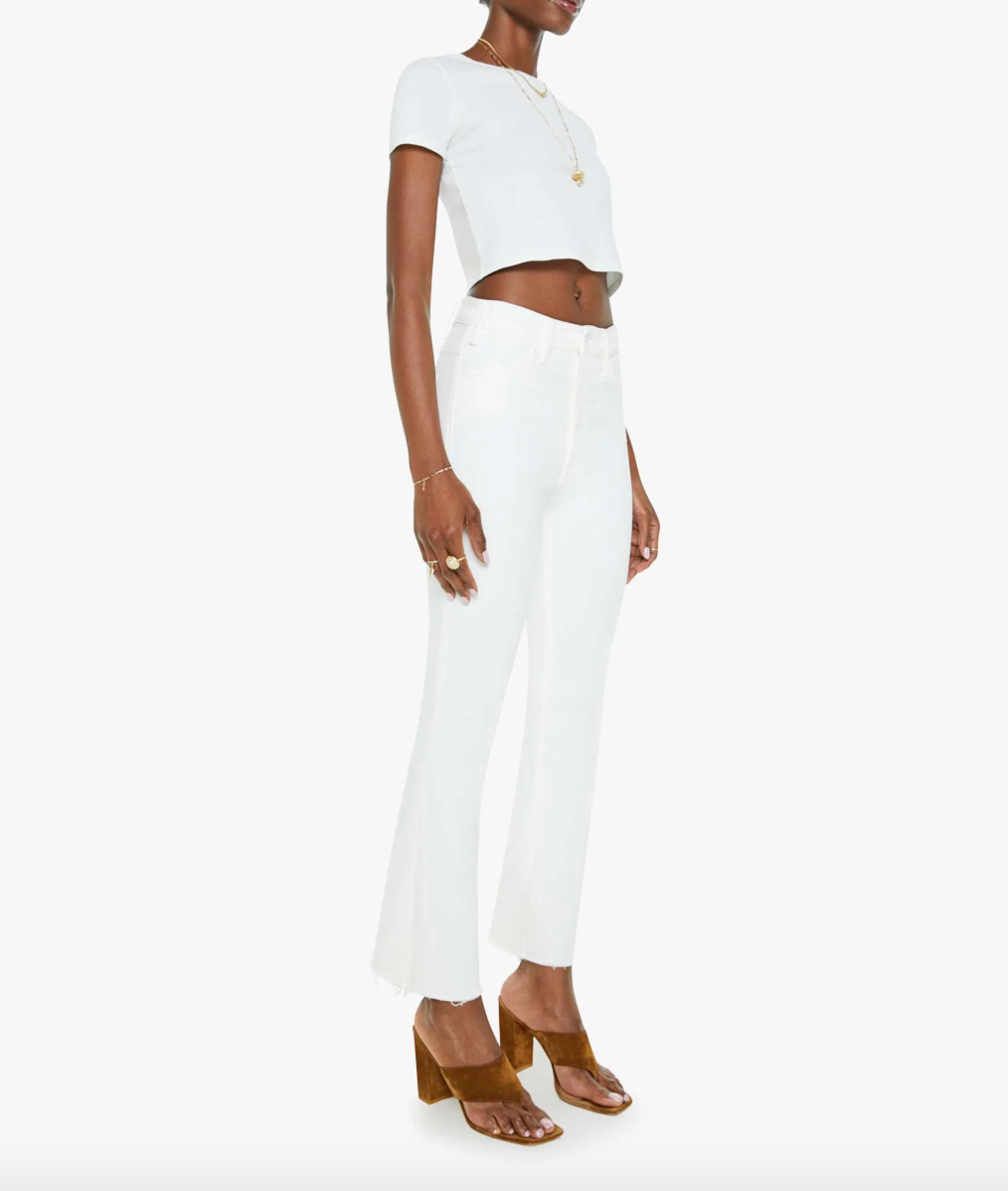 An expanded collection of foundational pieces designed for All Day, Every Day. Created for versatility, layering, and year-round wearability, these are the pieces you will never stop reaching for. This bestselling high-rise flare has an ankle-length inseam and a raw hem. Made from stretch fabric, Fairest Of Them All is our bestselling white denim.