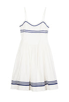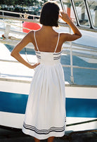 The Florencia Dress in white is a sailor-inspired, spaghetti strap midi-length dress featuring a fitted bodice and full skirt. The dress features back smocking and zipper closure. Straps are adjustable. The Florencia was featured on White Lotus and worn by the always stylish Piper and she can be yours too!