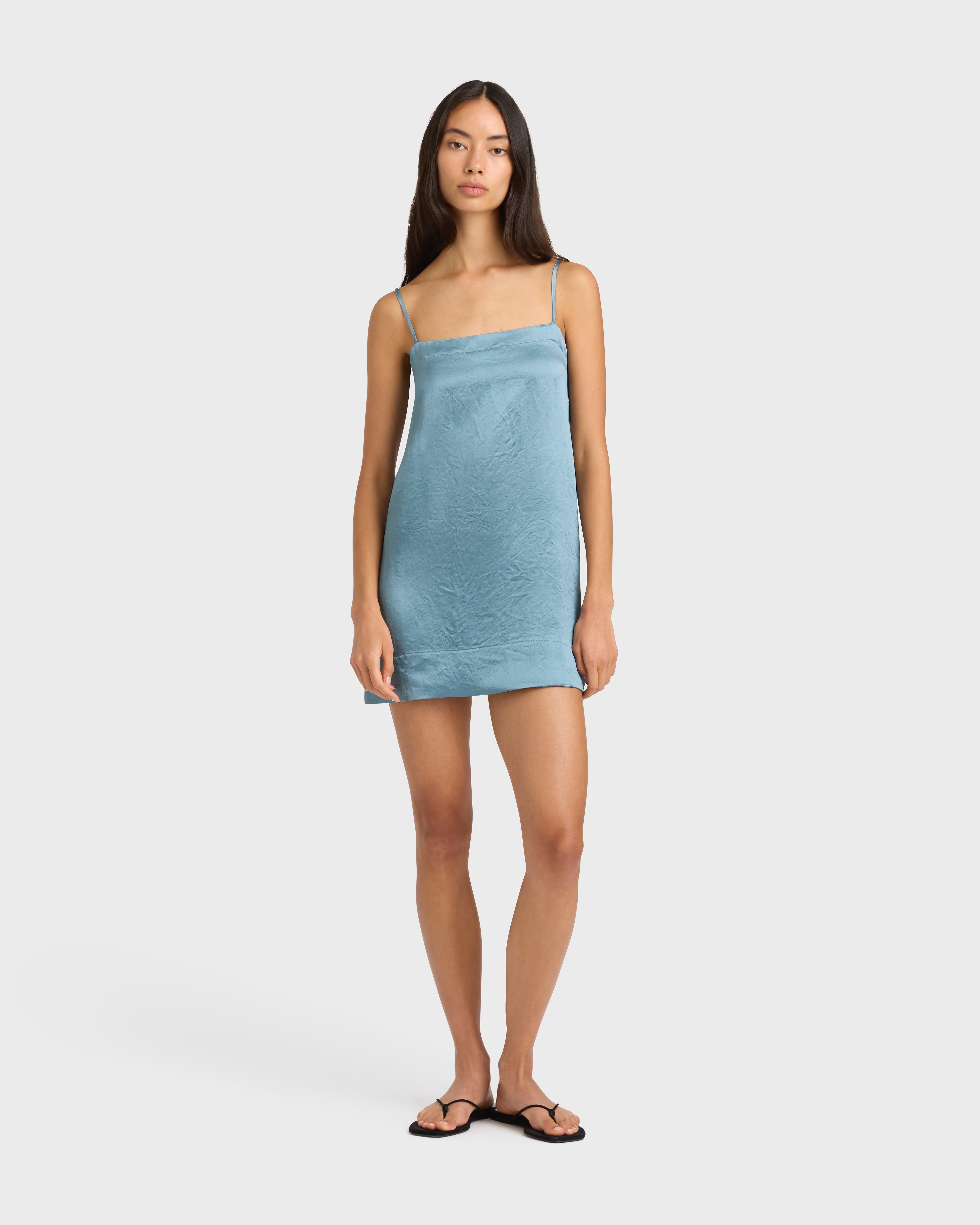 The Kobe Mini Slip Dress in Steel Blue is a minimalist silhouette, crafted from Japanese Naia™ acetate satin with a subtle sheen. Featuring a straight neckline and slender adjustable straps, this effortless mini falls straight from the hip for a relaxed fit.
