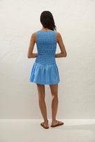 An everyday mini dress, designed from a signature 100% BCI Certified organic cotton, yarn-dyed in a vibrant azul blue stripe. Sleeveless with a boat-style neckline, the bodice is shirred with a gathered waist. It then falls into a soft A-line skirt that crops short on the body. With lightweight throw-on throw-off appeal, pack for your next summer vacation.