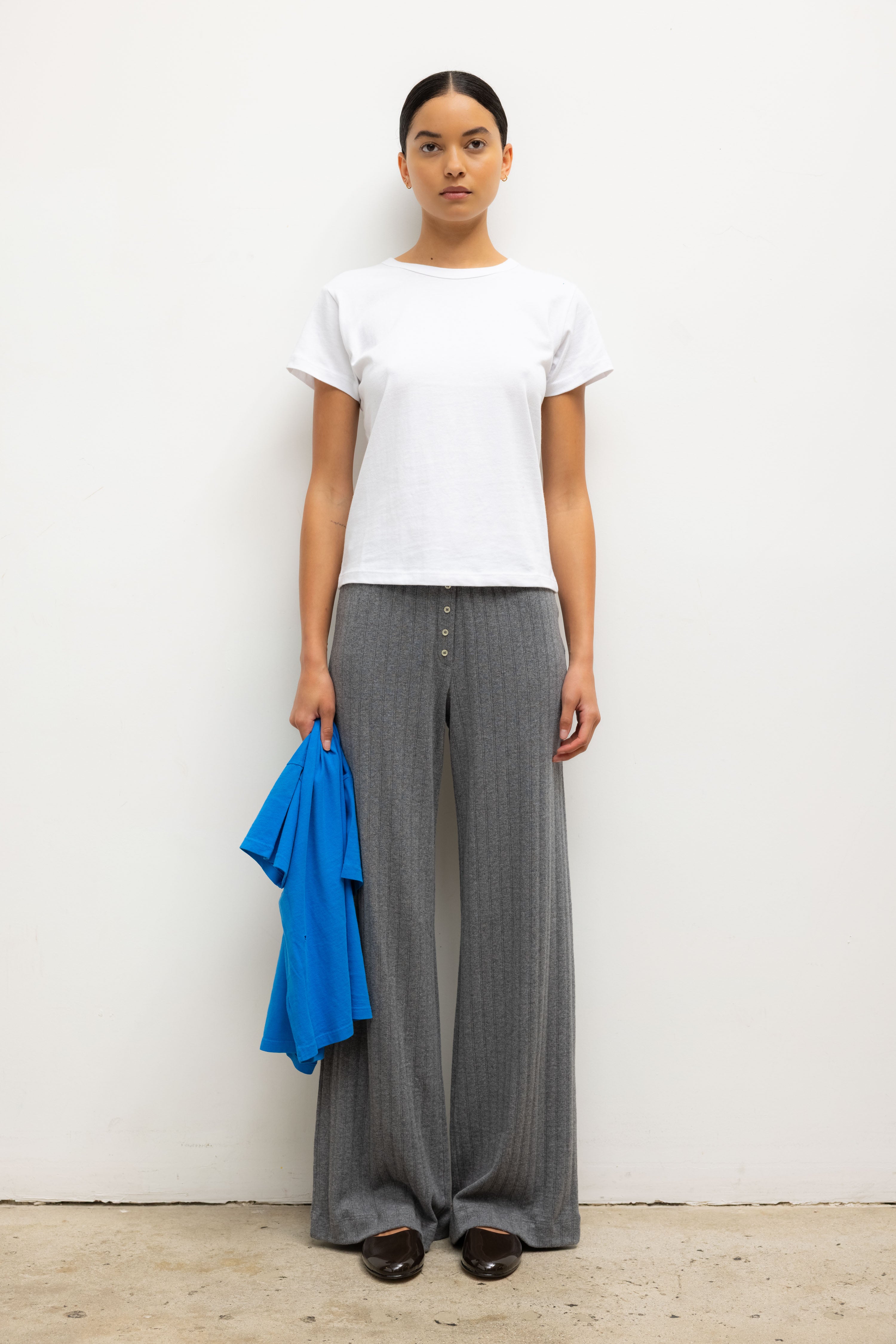 Cut in our nostalgic Pointelle Cotton, The Pointelle Boxer Pant is a wide leg silhouette featuring our signature pinhole stripes, dainty eyelets, tonal henley buttons and a comfortable elasticized waistband that sits at the natural waist.