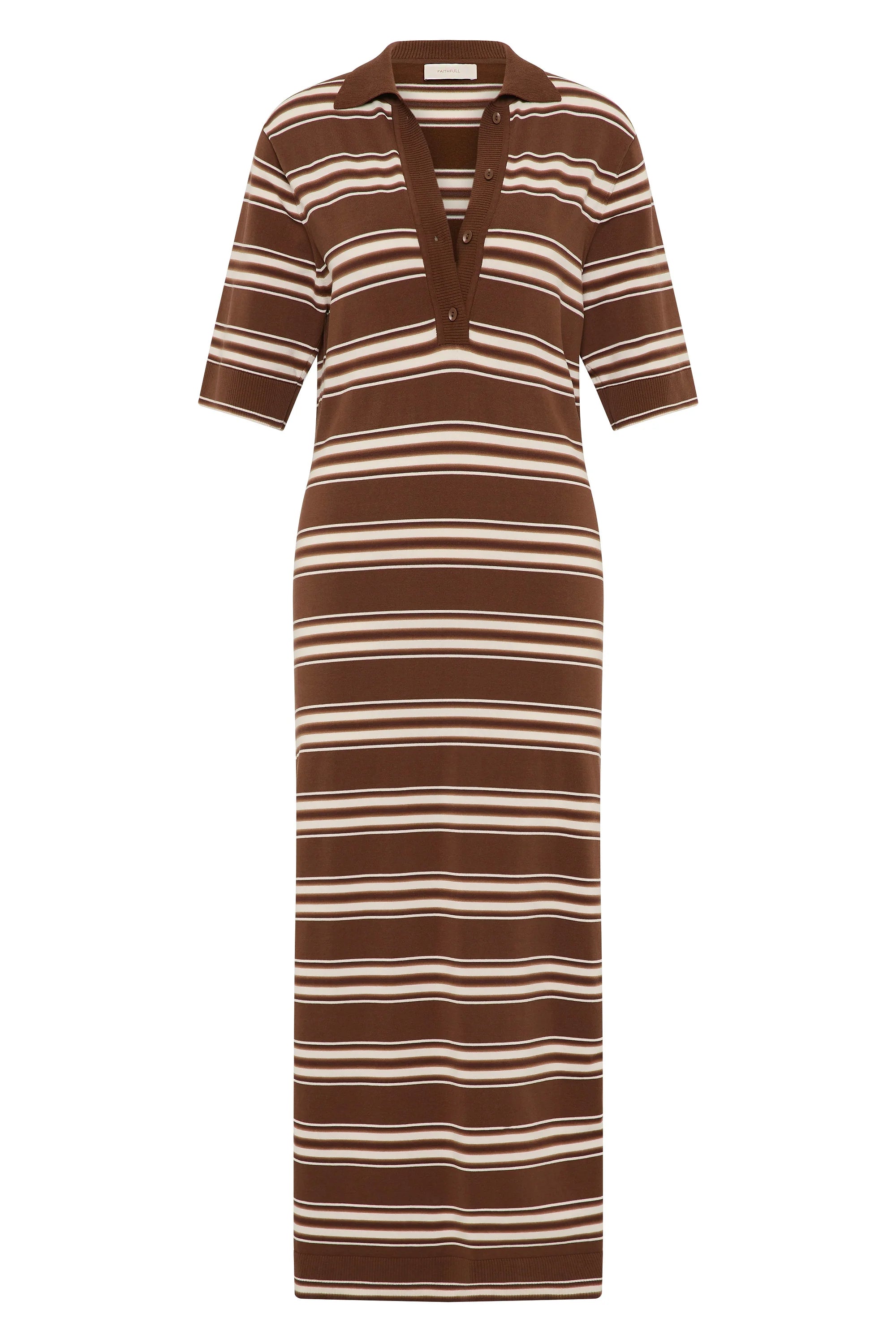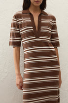 A polo-style midi dress, designed from a signature true knitwear fabrication in a chocolate brown stripe. Featuring a classic collar neckline and mid-length sleeves, it is a relaxed silhouette that is designed to hang effortlessly off the body. There are two side splits at the hem for a feminine touch. Style with a simple sandal for effortless, everyday appeal.