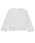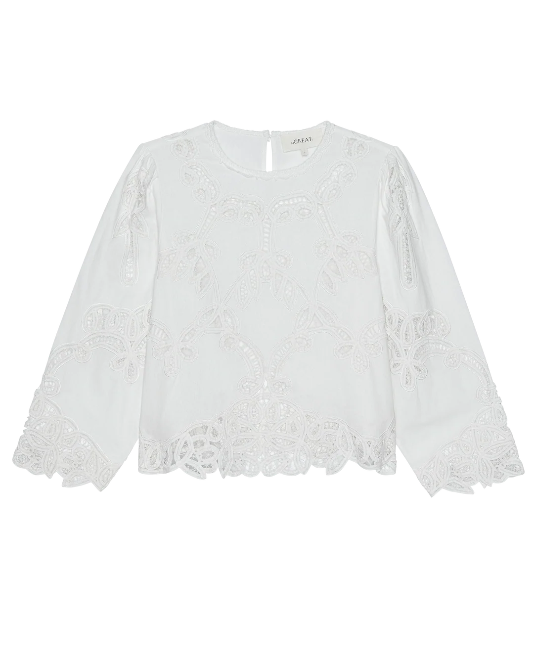 The Picnic Top is cut from structured cotton with a soft hand. The allover lace recreates Battenburg lace, a decorative technique from the late 19th century, constructed by basting woven tapes onto fabric and joining them with ornamental needle stitches. The fit is loose and easy with a boxy silhouette and straight sleeves designed to hit just above the wrist. Finished with a crew neckline trimmed in crochet lace and a back keyhole closure with button and loop.
