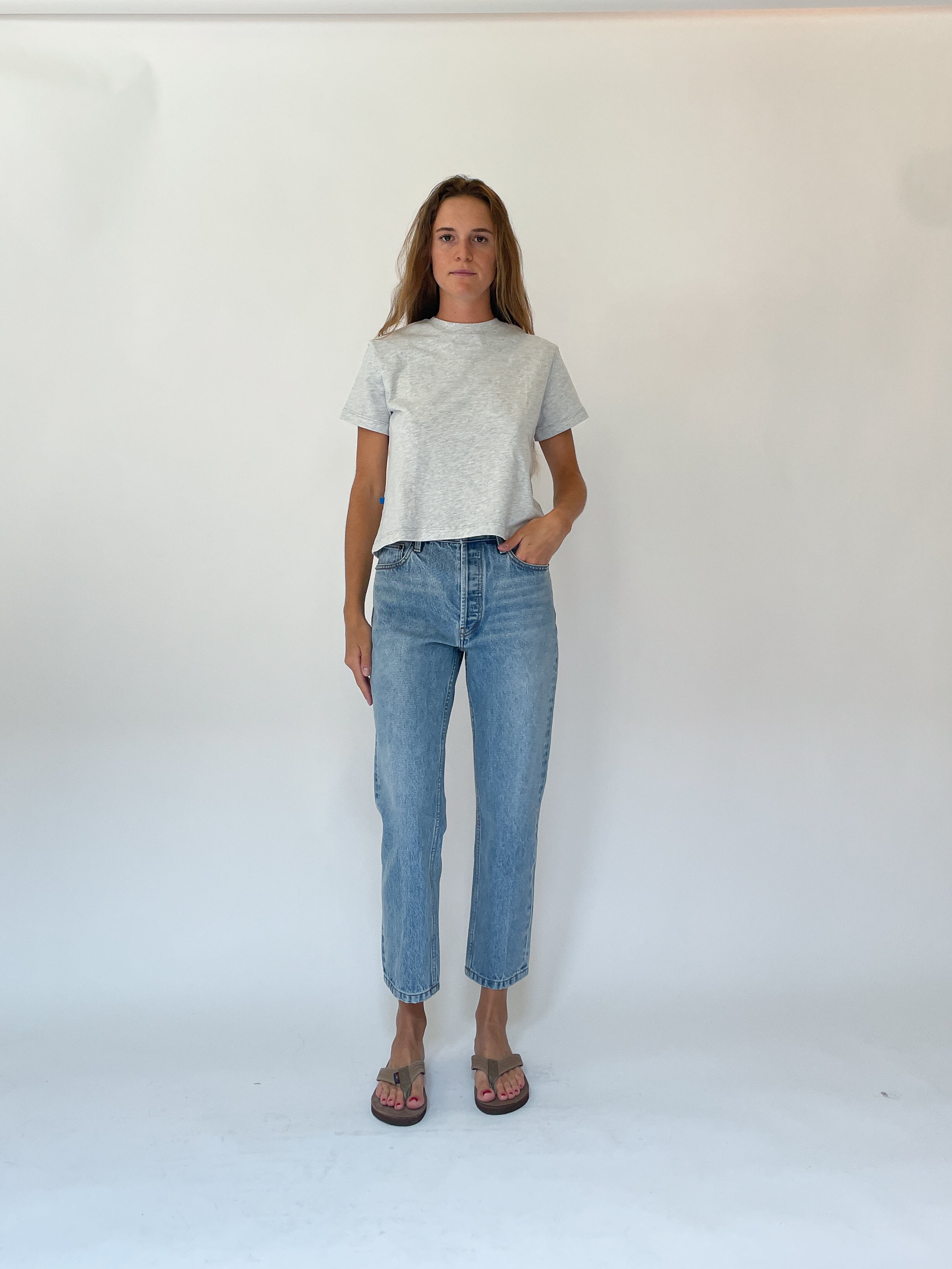 The Tate is our classic vintage style jean. It's a tapered leg, hi-rise, crop wedgie fit with a detailed focus on lifting and flattering. It features a traditional button fly and our signature 'SH' embroidery. The Tate is our first and best-selling fit.