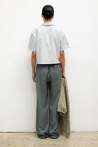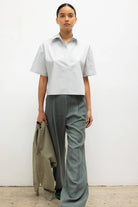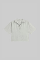 Cut in our Yoshi Cotton Twill, The Yoshi Stripe Short Sleeve Polo is a boxy silhouette that features a classic pointed collar with V neck and slightly elongated sleeve.