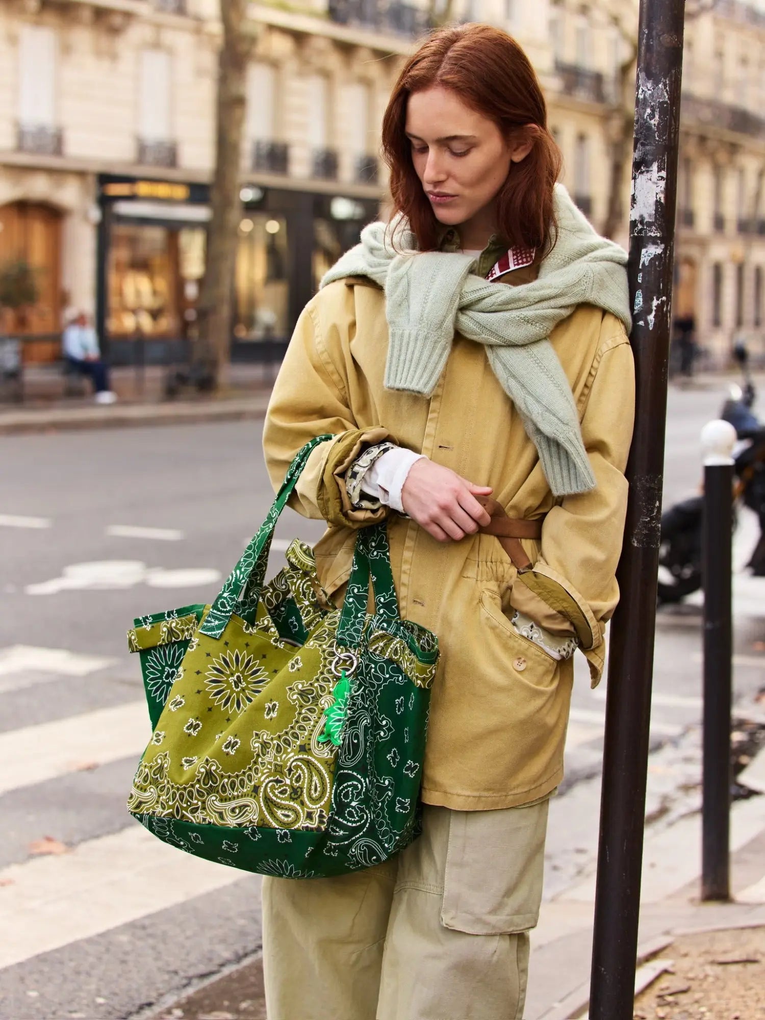 Multi-pockets inside and out. The bag has a hanging ring on either side for adding a shoulder strap or charms. Bandanas made in the USA. Composition: 100% cotton Dimensions : W 54 cm x H 34 cm x D 35cm I W 21,2 inch x H 13,3 inch x D 13,7 inch Shoulder strap length: 60 cm / 23.6 in Hand-carried handle length: 22 cm / 8.6 in