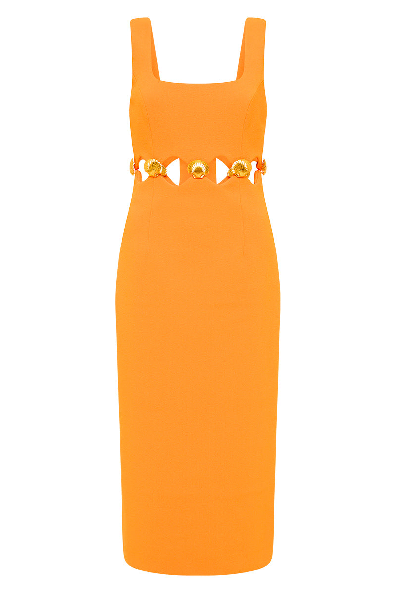 The Sirene Midi Dress in orange is a charming dress, a fitted bodice to form a flattering silhouette. Featuring gold shells to enhance and accentuate the cinched waist. At the back, a zip fastening and back split adds comfort and style.