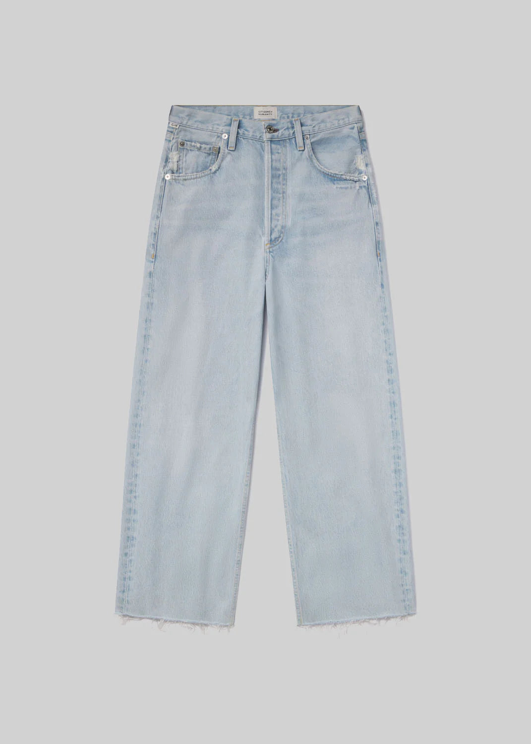 Looks Like: Light indigo denim with raw hem
