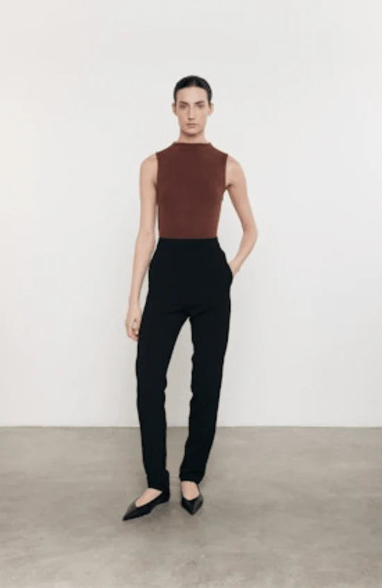 This sleeveless mockneck top is made from our soft and luxe silk rib fabric, knitted in Los Angeles. It offers a body-skimming fit with flattering stretch, featuring the brand's signature center back seam. Wear this versatile piece layered or on its own.