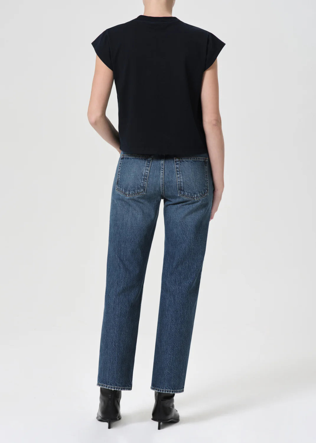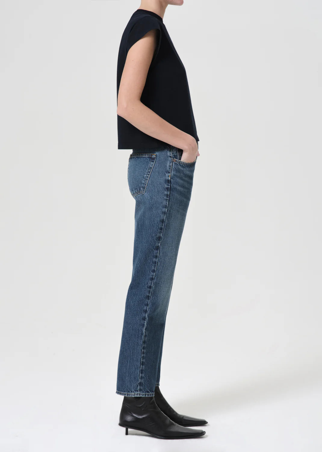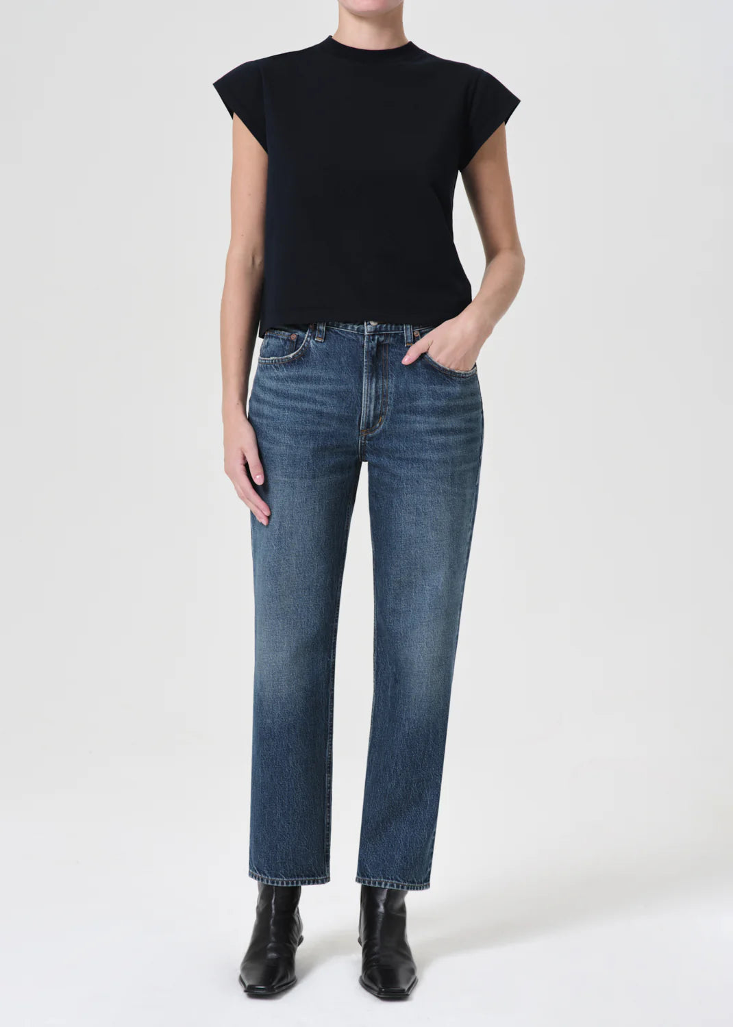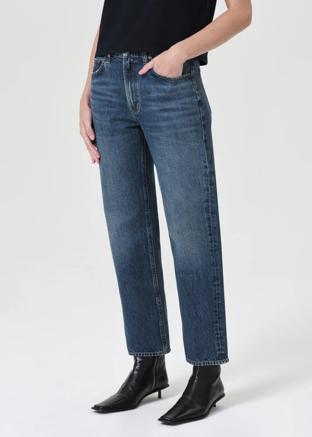 Mid-rise vintage straight with an ankle-grazing inseam. Designed with a flattering square top block.