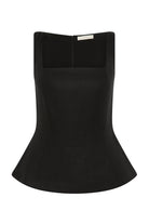 An elevated everyday top, designed from a signature 100% European Flax® linen in a classic black. With a square neckline and wide shoulder straps, it is fitted through the bodice before cinching in slightly at the waist and flaring into a peplum hem that crops around the hips. Softly tailored but with an ease of wear, styling with the matching Valeria Capri for timeless set dressing.