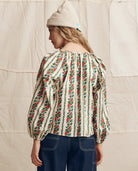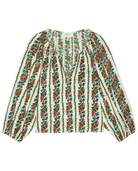 The Chariot Top is cut from crisp cotton with subtle sheen and structure. It features an open neckline with a deep front slit, soft shirring, and full sleeves that taper at the wrist.Printed in the season’s Tapestry Floral—a delicate, colorful floral motif.
