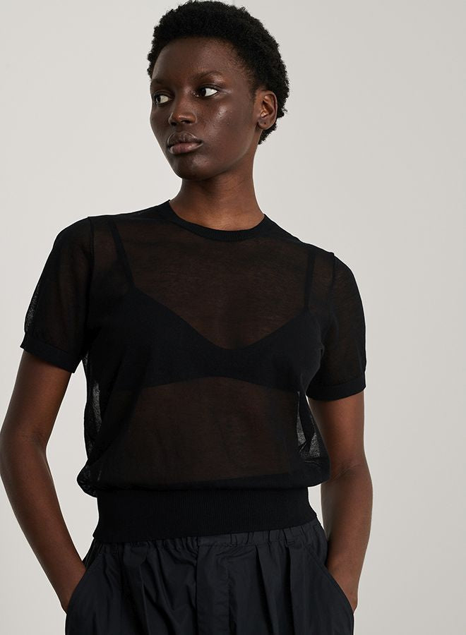 DUA is a short-sleeved jumper knitted in an ultra-fine knit. Transparent, it can be worn on its own or layered with a dressy or casual top depending on the look you want to achieve.