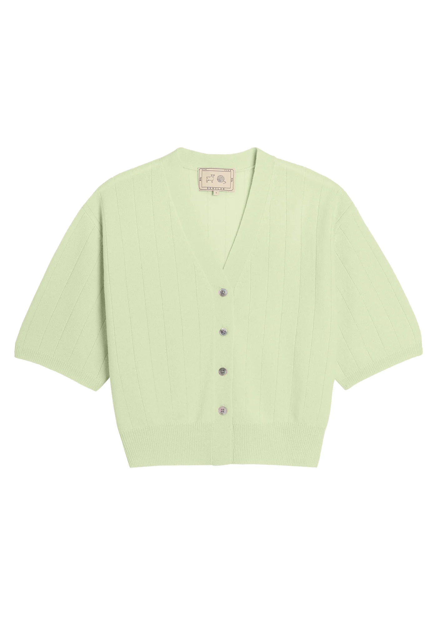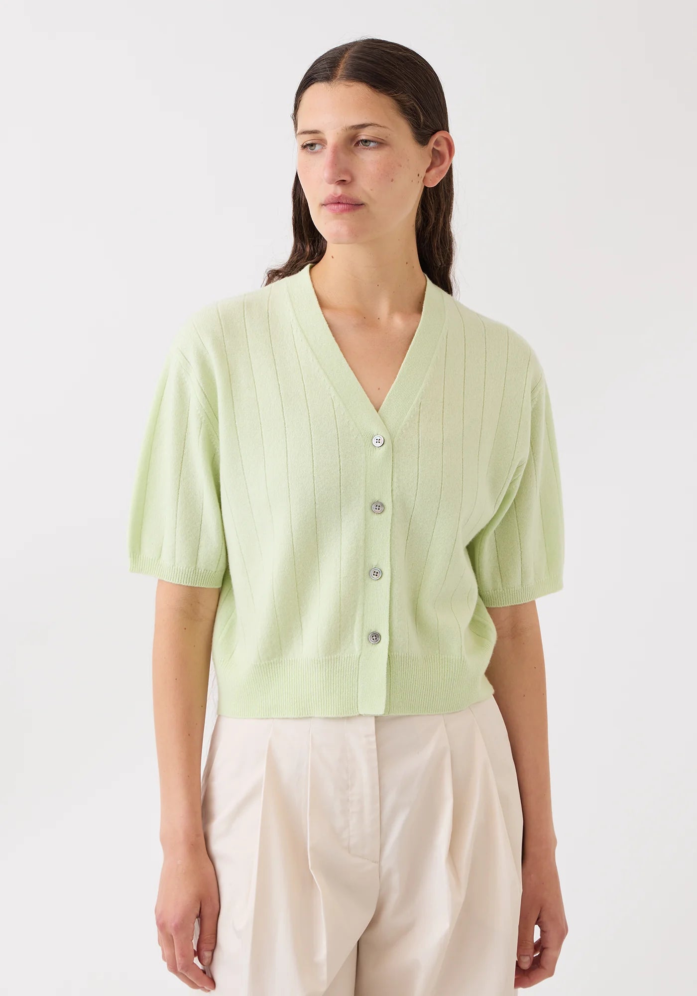 Relaxed v-neck cardigan with half-length sleeves, petite grey shell buttons, and tidy rib trims. Drop-needle texture creates subtle wide ribs.